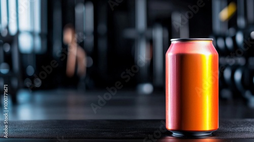 A bright, modern energy drink can on a gym bench, with weights and workout equipment in the background, symbolizing energy and endurance