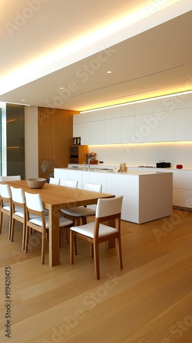 A bright modern kitchen with white cabinets, a wooden dining table, and ample natural light from a large window, seamlessly connecting to a stylish living room