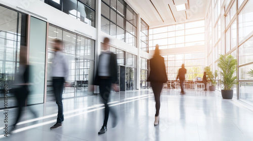 A bright, modern office space with employees walking through a hallway, featuring glass walls and natural light.