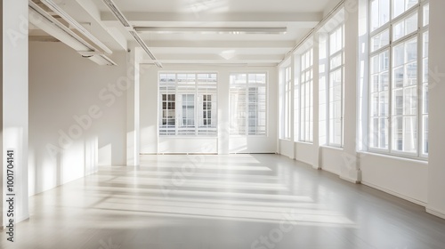 A bright office space with a spacious layout, large windows allowing natural light, and minimalist decor, perfect for productivity