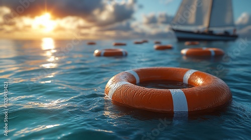 A bright orange life preserver floats in the ocean with a sailboat in the background.