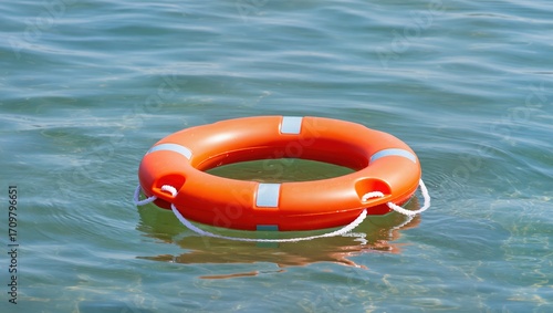 A bright orange lifebuoy featuring white rope floats upon the calm blue seawater under daylight, symbolizing safety and rescue equipment within the peaceful marine setting