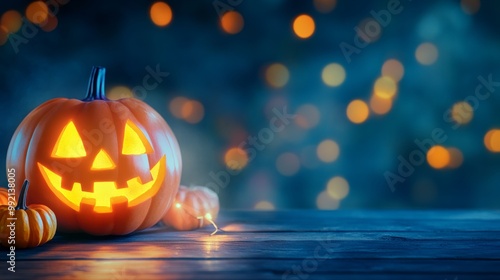 A bright orange pumpkin with a carved creepy face, lit from within by a candle, against the backdrop