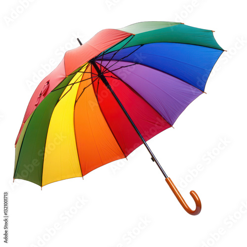 A bright, rainbow-colored umbrella, open wide, isolated on white background.