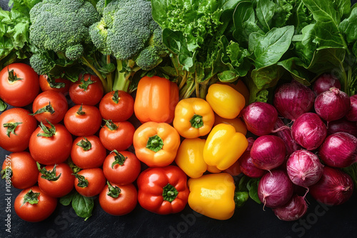 A bright set of fresh vegetables, neatly laid out on a black background. In the center are red tomatoes, yellow and orange bell peppers, broccoli, greens and red onions