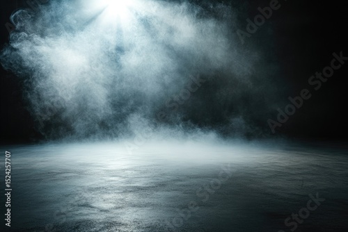 A bright spotlight illuminates a dark, smoky, textured floor, creating a dramatic, atmospheric scene