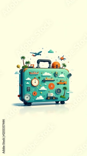 A bright suitcase surrounded by travel-themed elements and tropical landscapes. Illustrated on a white background.