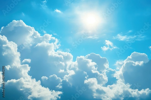 A bright sun shines through fluffy white clouds in a clear blue sky