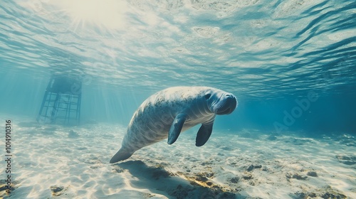 A bright underwater scene features a manatee swimming in clear turquoise water, illuminated by sunlight filtering through the surface, showcasing marine tranquility.