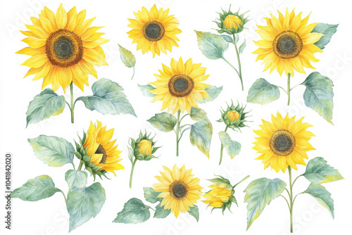 A bright watercolor collection of large sunflowers with vibrant yellow petals and green leaves, hand-drawn in a summer style. Each flower is meticulously painted and isolated on a white background,