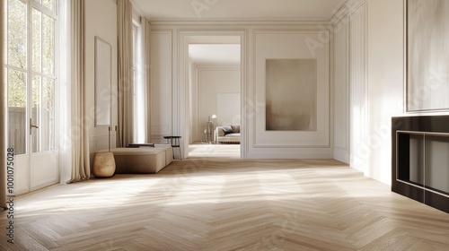 A bright white oak parquet floor with a herringbone pattern, illuminated by natural light to highlight the refined texture of the wood.
