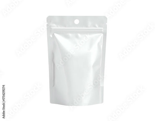 A bright white, stand-up pouch with a rounded bottom and a small hang hole at the top