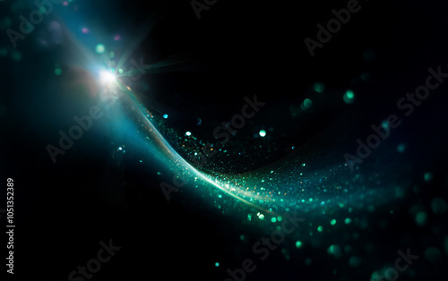 A bright, white star shines in the distance, illuminating a curved trail of shimmering turquoise dust that fades into a dark, starry void.