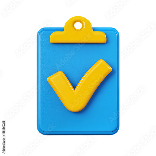 A bright, yellow checkmark on a blue clipboard. The icon conveys success, completion, and positivity