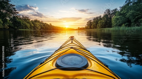 A bright yellow kayak glides across the calm waters as the sun sets, casting warm hues over the serene landscape of trees and reflections