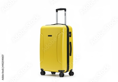 A bright yellow suitcase with a telescoping handle stands on a white background in a studio shot