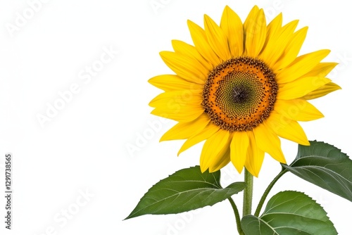 A bright yellow sunflower with green leaves on the stem, against a white background, in a high-resolution photo, with high quality, professional photography, sharp focus, and studio lighting.