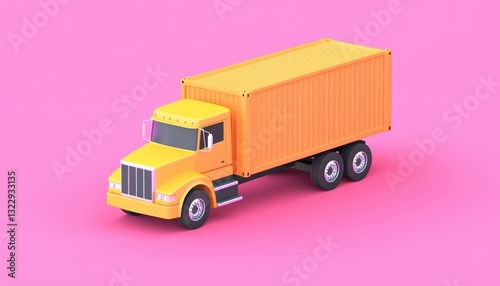 A bright yellow toy truck with a container stands against a pink background, showcasing a playful and vibrant design.