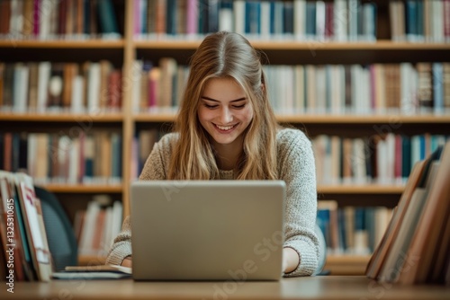 A bright young woman is enjoying her language studies through online courses on her netbook. She is a smiling student working on her homework in the college library, looking up information on her lap