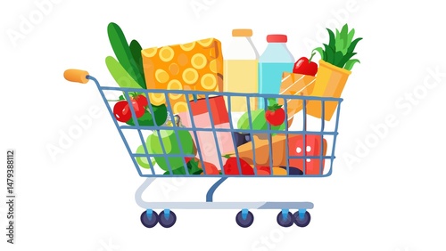 A brightly colored shopping cart filled with fresh groceries and various food items representing shopping and health, JPG.