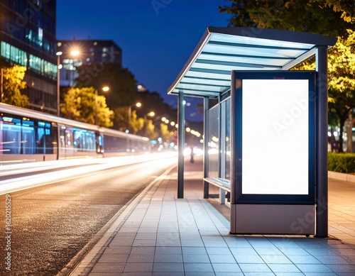 A brightly lit bus stop shelter on a city street at night, with a blank advertisement screen and blurred car lights creating streaks of motion.