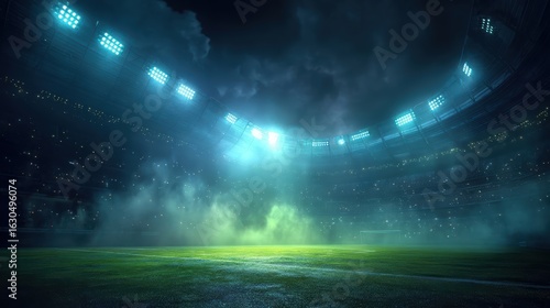 A brightly lit, empty soccer stadium under dramatic night skies, with mist and spotlights creating an atmospheric scene