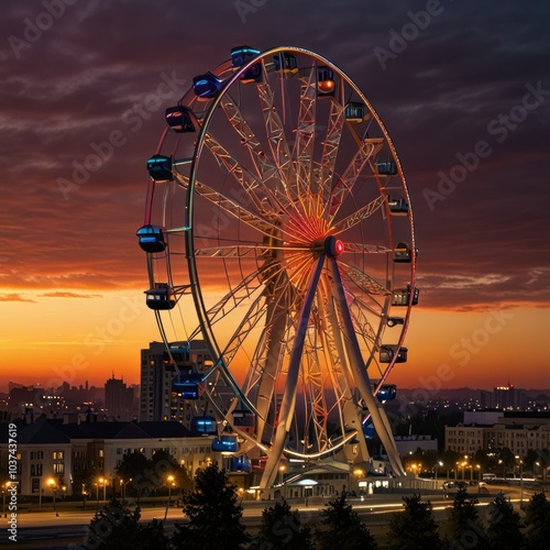 A brightly lit Ferris wheel at sunset with city lights and buildings in the background.