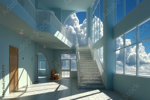 A Brightly Lit Interior Space with a Curved Staircase and Large Windows Offering a View of the Sky