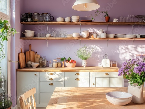A Brightly Lit Kitchen Interior with Shelving and Decorative Elements