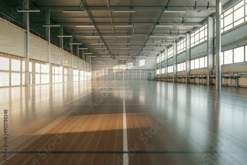A brightly lit, modern fencing hall with polished floors and sleek, well-maintained equipment.