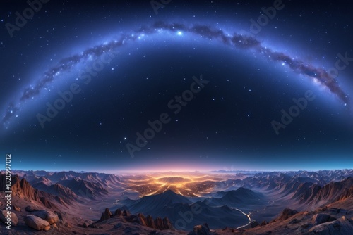 a brightly lit mountain landscape with a rainbow of stars and a distant galaxy