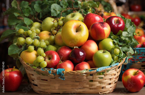 A brightly overflowing supermarket basket, brimming with fresh produce and pantry staples glossy apples, vibrant greens, and gleaming cans