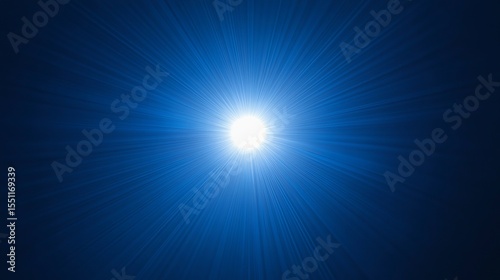 A brilliant white light radiates outwards, casting luminous blue rays against a deep blue backdrop. The image evokes feelings of energy and intensity