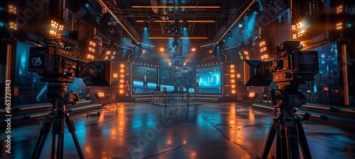 A Broadcast Studio with 3 Separate LED Wall Displaying a Video Conference Call with Fifty Professionals and the Main Speaker Before the LED Wall with a Camera on a Tripod Directed