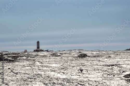 A broken telegraph pole on a snow-covered Arctic hill. Minimalistic polar landscape.