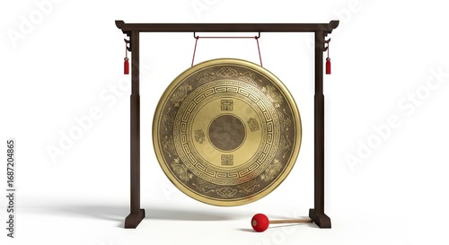 A bronze gong with intricate carvings hangs from a dark wood frame resting on a white surface with a red mallet nearby
