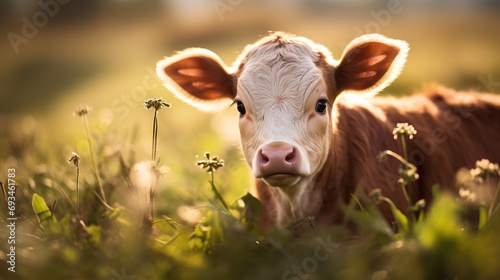 a brown and white baby cow on a farm