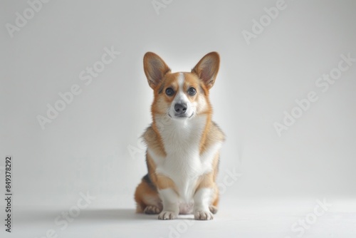 A brown and white dog sits on a white surface, ideal for pet-related or home decor contexts