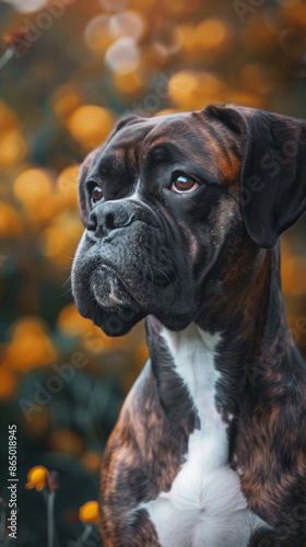 A brown and white serious dog with a black nose and brown eyes is looking away