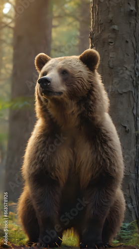 a brown bear standing in the woods looking up