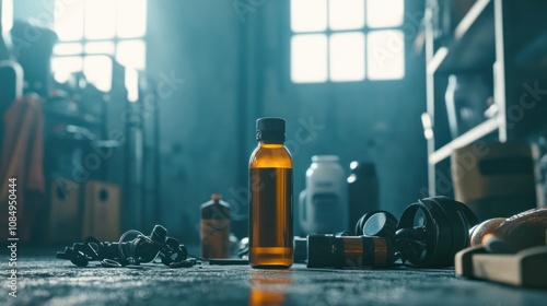 A Brown Glass Bottle and Other Objects on a Dusty Workshop Floor
