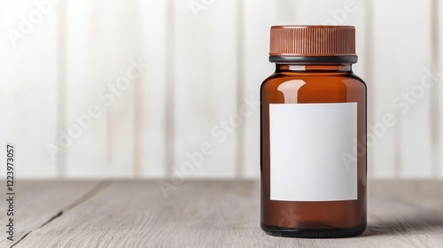 A brown glass bottle with a wooden cap and a blank label sits on a wooden surface against a light backdrop.