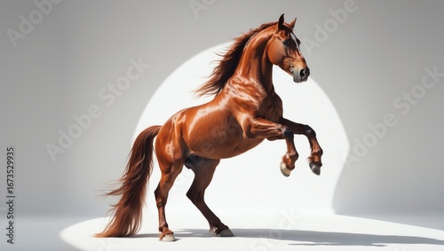 A brown horse rearing with one front leg raised, highlighted by a circular spotlight on a plain background.