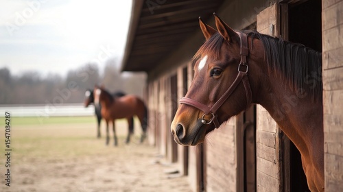 A brown horse with a white spot on its face stands in a stable, looking out, with another horse in the background.