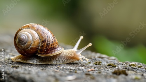 A Brown Snail Crawling on a Moss-Covered Rock in a Natural Setting