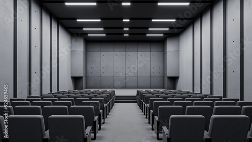 A brutalist movie theater with massive concrete walls sharp lines and a minimalist interior offering a unique cinematic experience