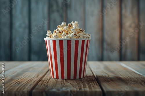 A bucket of popcorn is positioned on top of a wooden table, with no one around. The popcorn looks freshly popped, and the table is plain in design.