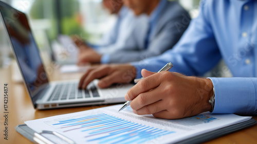 A budget review meeting features finance team examining spreadsheets on laptops CFO presenting quarterly results while department heads take notes financial meeting budget