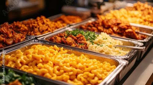 A buffet of classic comfort foods like macaroni and cheese, roasted chicken, and mashed potatoes on a white table.