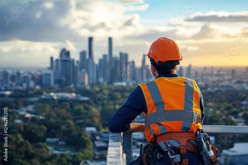 A builder wearing a high-visibility vest and helmet, leaning on a railing, overlooking the city skyline from a high platform.